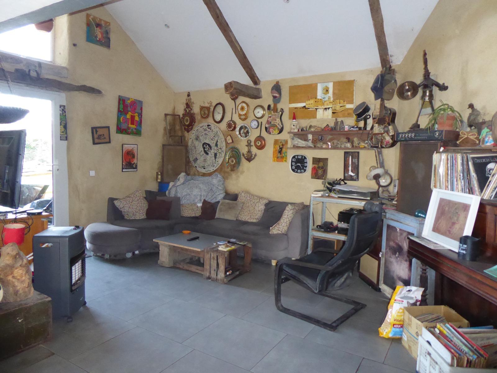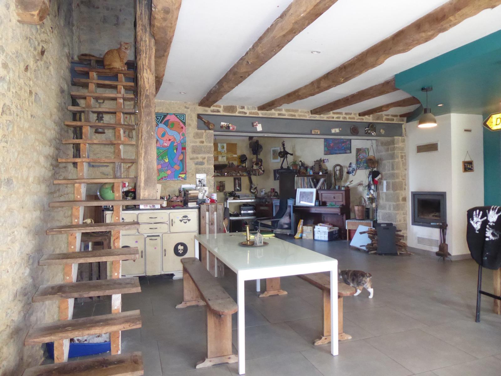 - au rez-de-chaussée : grande de pièce de vie d'environ 60m² avec coin cuisine, cheminée avec insert, salle d'eau avec WC ;